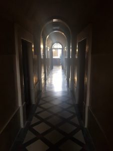 Visitors can visit the sacristy at the rear of the church, this is one of the connecting corridors and there are tombs on one side.
