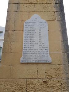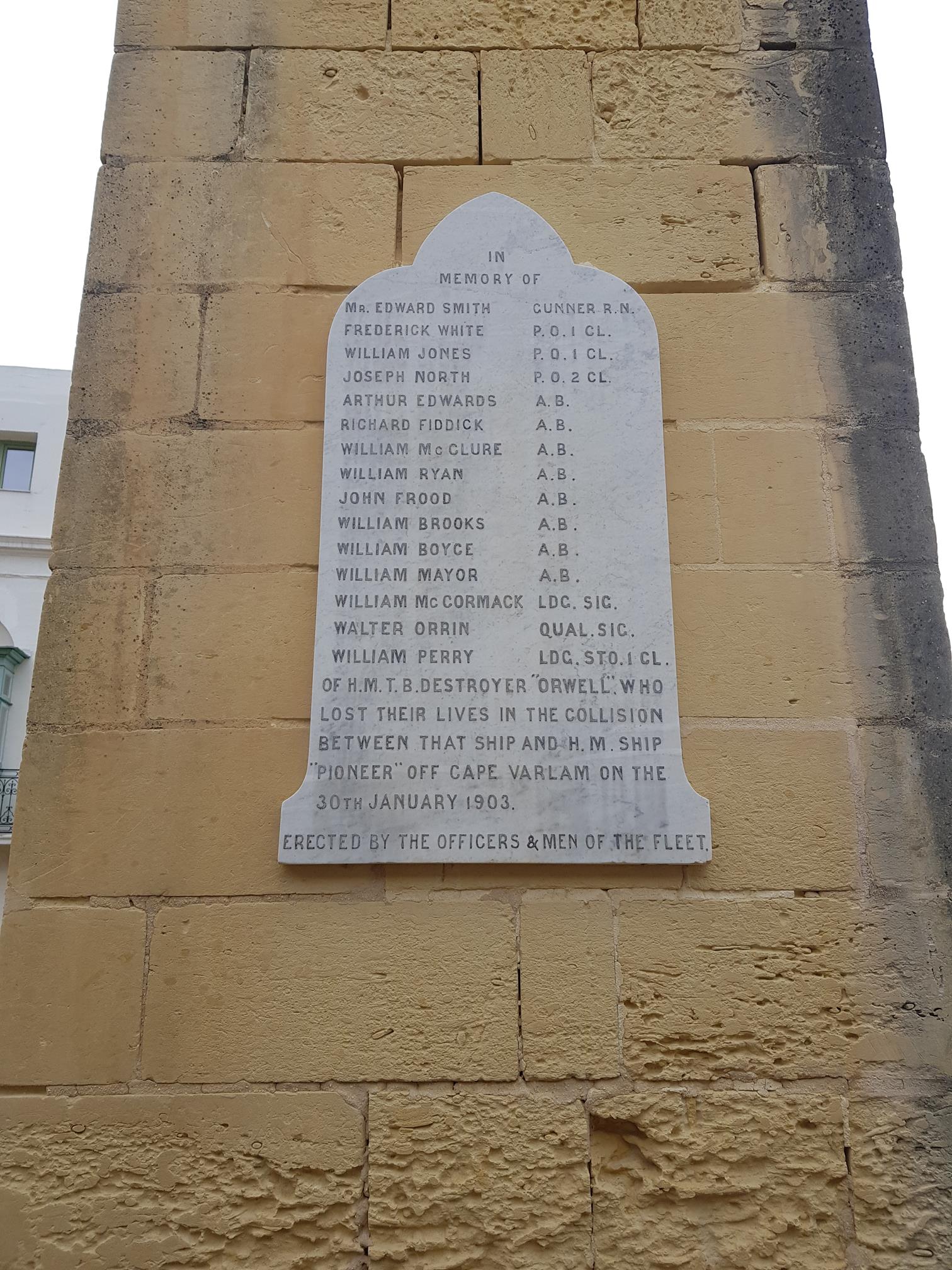 Located in Upper Barrakka Gardens is this memorial to 15 men who died on the HMS Orwell when it was in collision with HMS Pioneer on 30 January 1903. The incident happened off Corfu and this memorial was funded by the officers and men of the fleet. The memorial is here as HMS Orwell was part of the Mediterranean fleet, which was stationed at Malta.