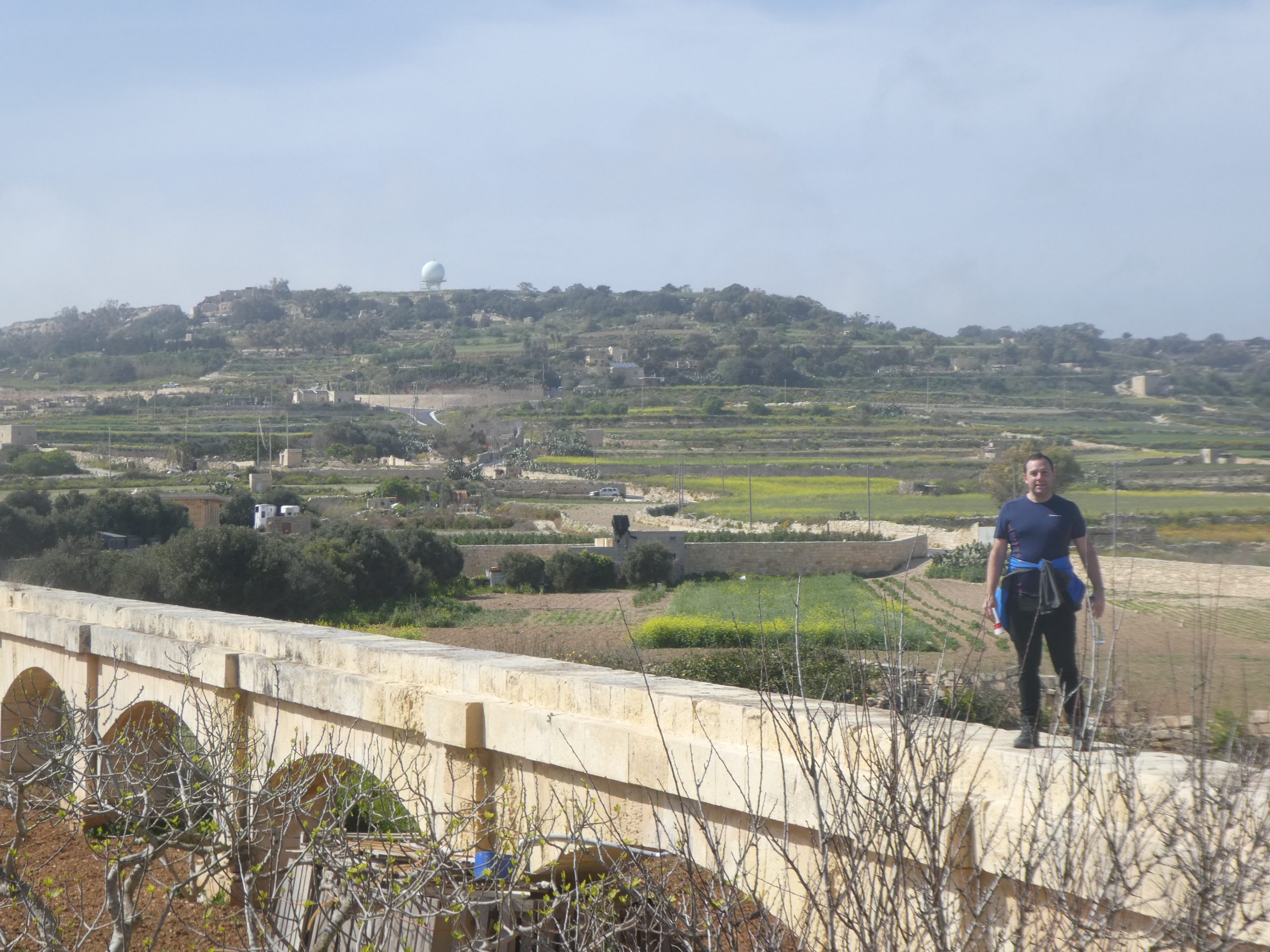The aqueduct and Liam, with the route of the original stone structure being difficult to follow on an overhead map as much of it seems to have been destroyed without trace.