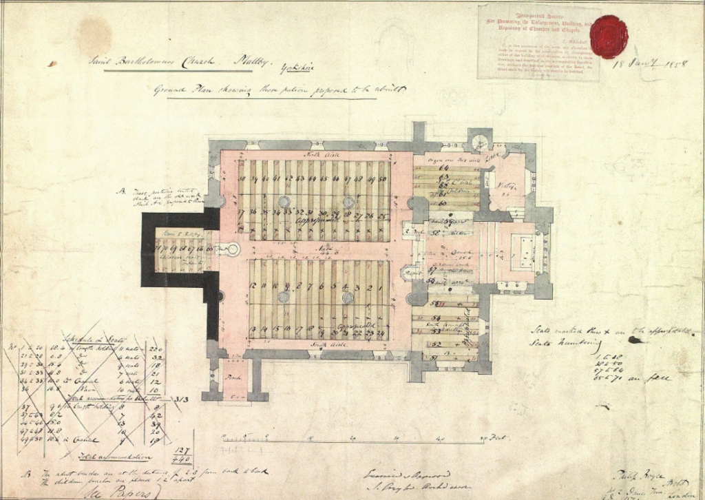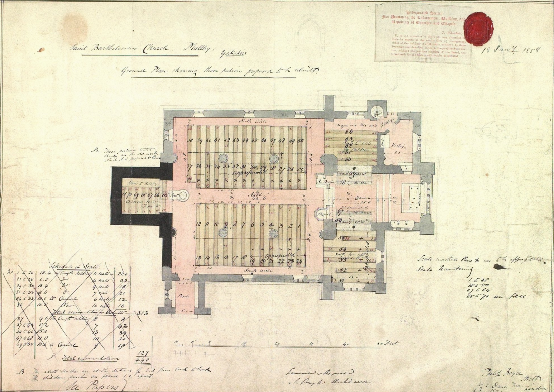 And here’s the reason for the main part of the church being less interesting architecturally, it’s the 1857 plan for the new building. This wasn’t though naive expectations of permanently larger congregations, something which somewhat dominated a lot of Church of England thinking in the late nineteenth century, this was the reality that the building was “too dilipidated to be repaired”. The local landowners, the congregation and the Incorporated Society for the Promoting the Enlargement , Building and Repairing of Churches and Chapels all came together to fund the repairs.