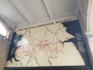 Whilst meandering around the railway station of Manchester Victoria waiting for my train to Newcastle, I saw this rather impressive tiled map of the Lancashire and Yorkshire Railway. It’d be quite hard to miss it, it’s a not inconsiderable map on the wall.