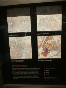 The museum used many different types of exhibits to explain the history of civil rights and this graphic was presented early on in the exhibition route. It is a map of where in four major cities the African American, White, Asian and Latino populations currently live. So, although the Jim Crow laws of segregation no longer exist, it’s clear that the reality on the ground is that they still have a legacy effect today.