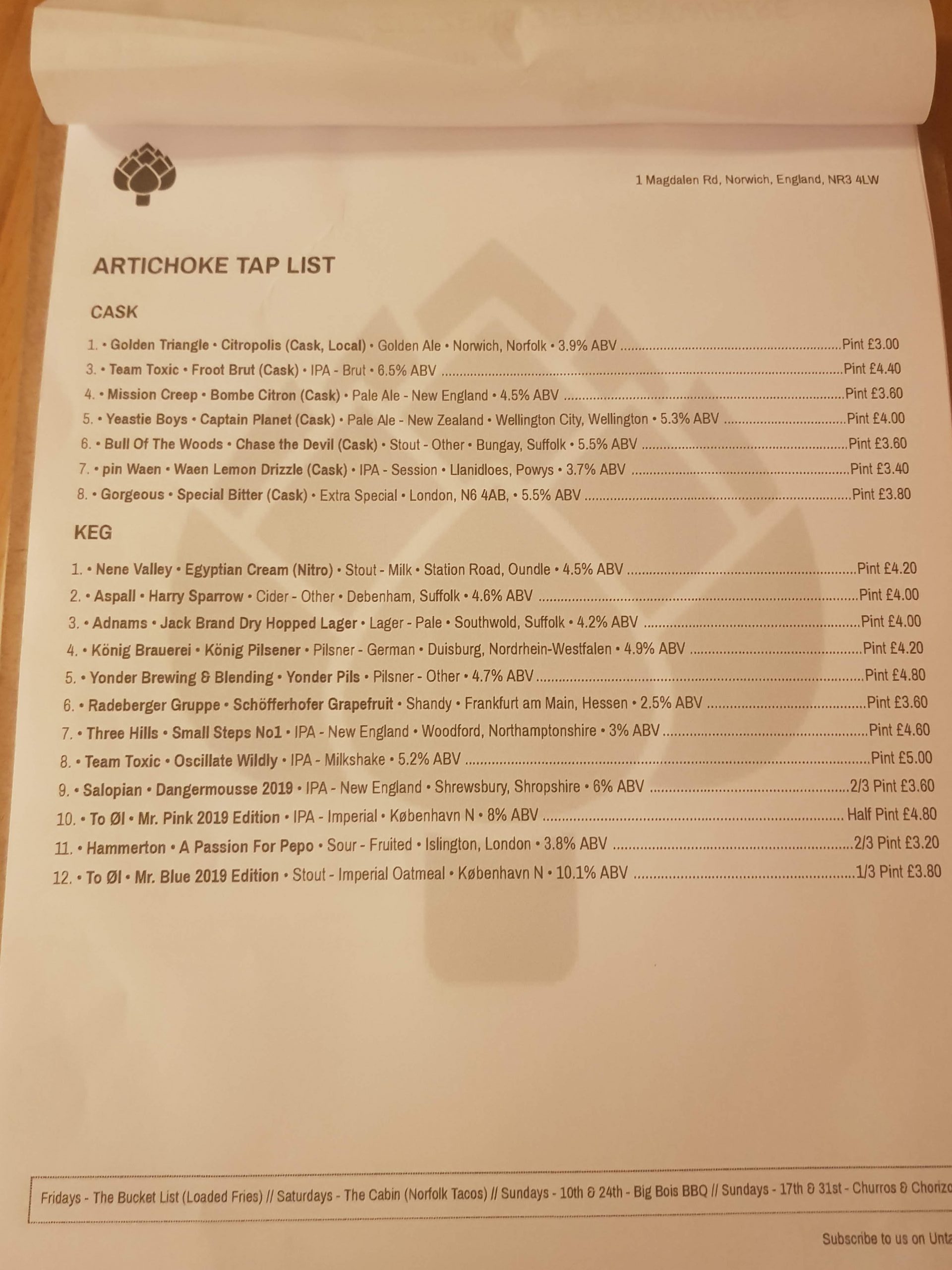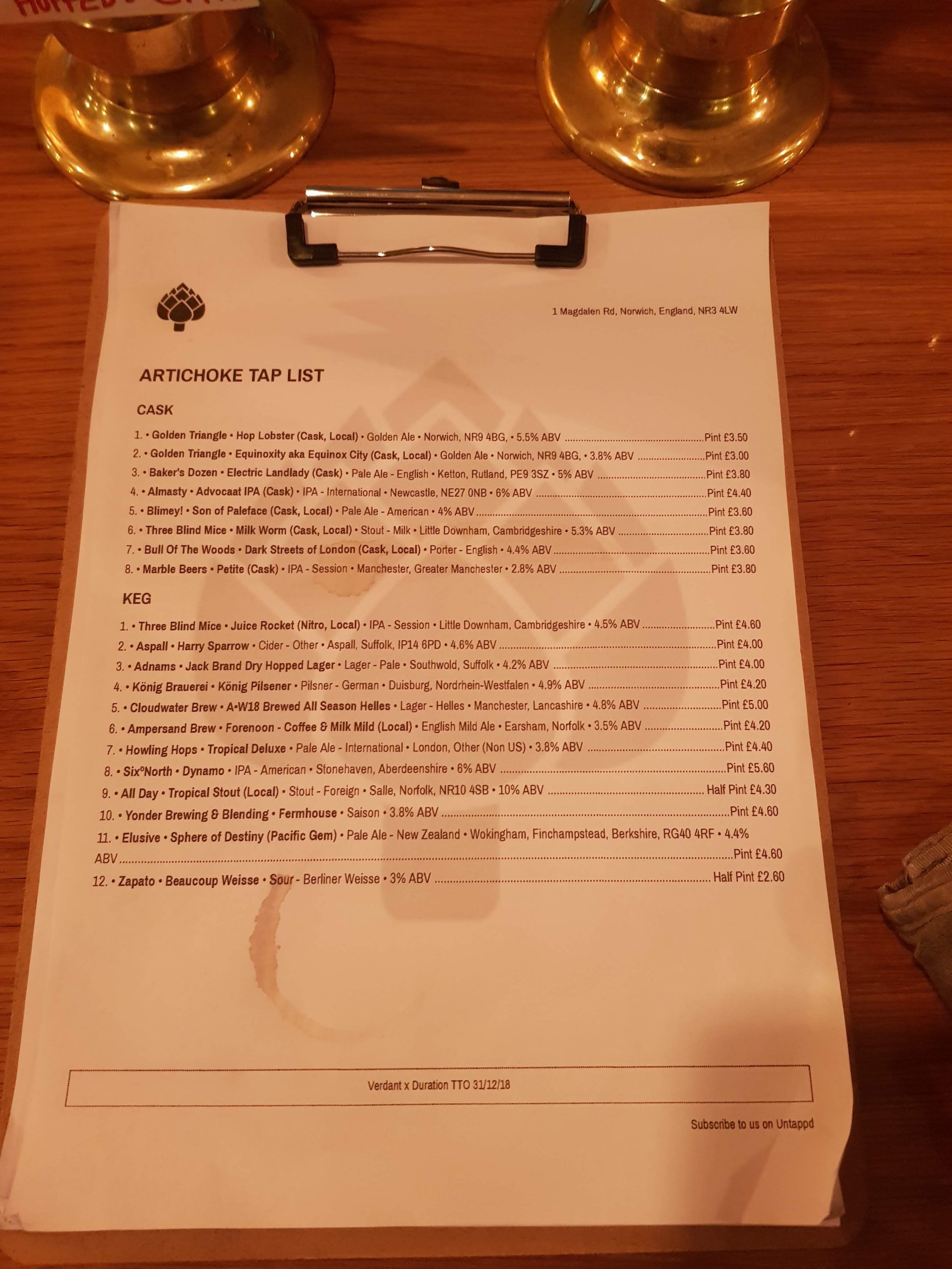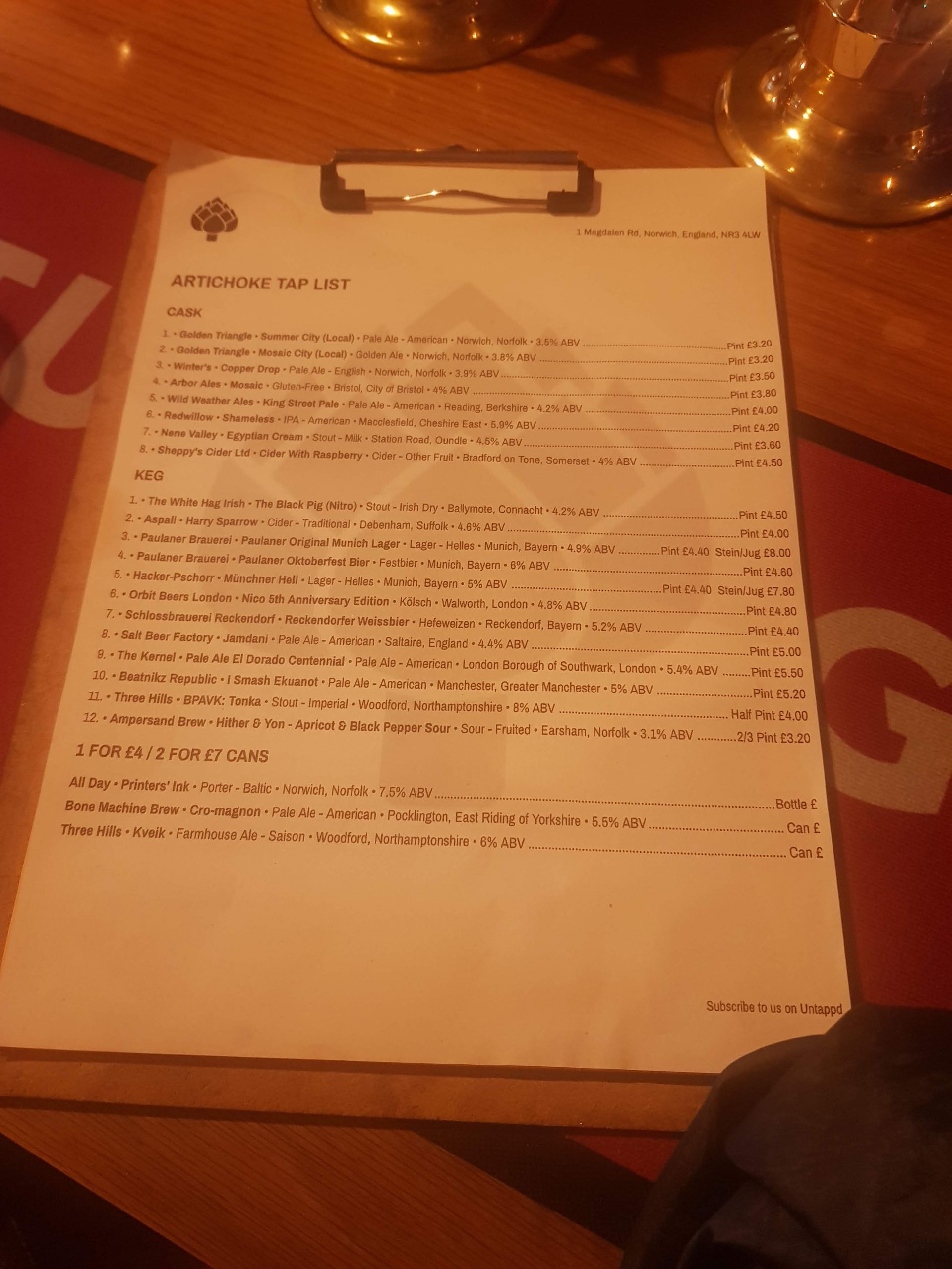 The beer selection in the Artichoke is what I’d consider to be the best in Norwich, not reliant on a few generic and dull options, but instead offering an ever changing selection of beers. The outstanding ones from my visit yesterday were: