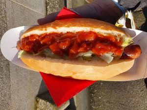 (i) The Classic – pork sausage with cheese, onion and homemade ketchup (£3.50)