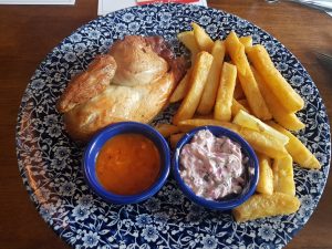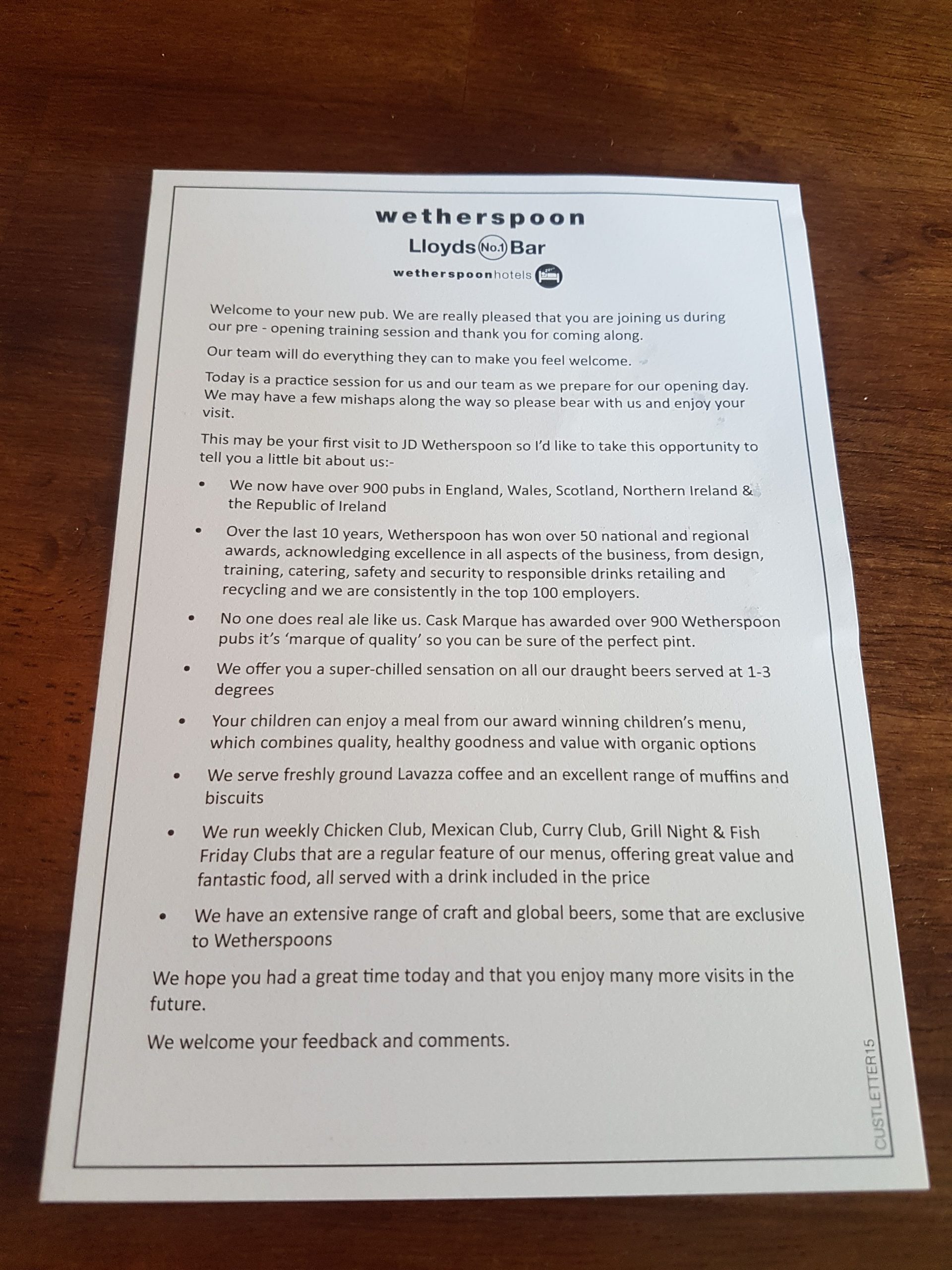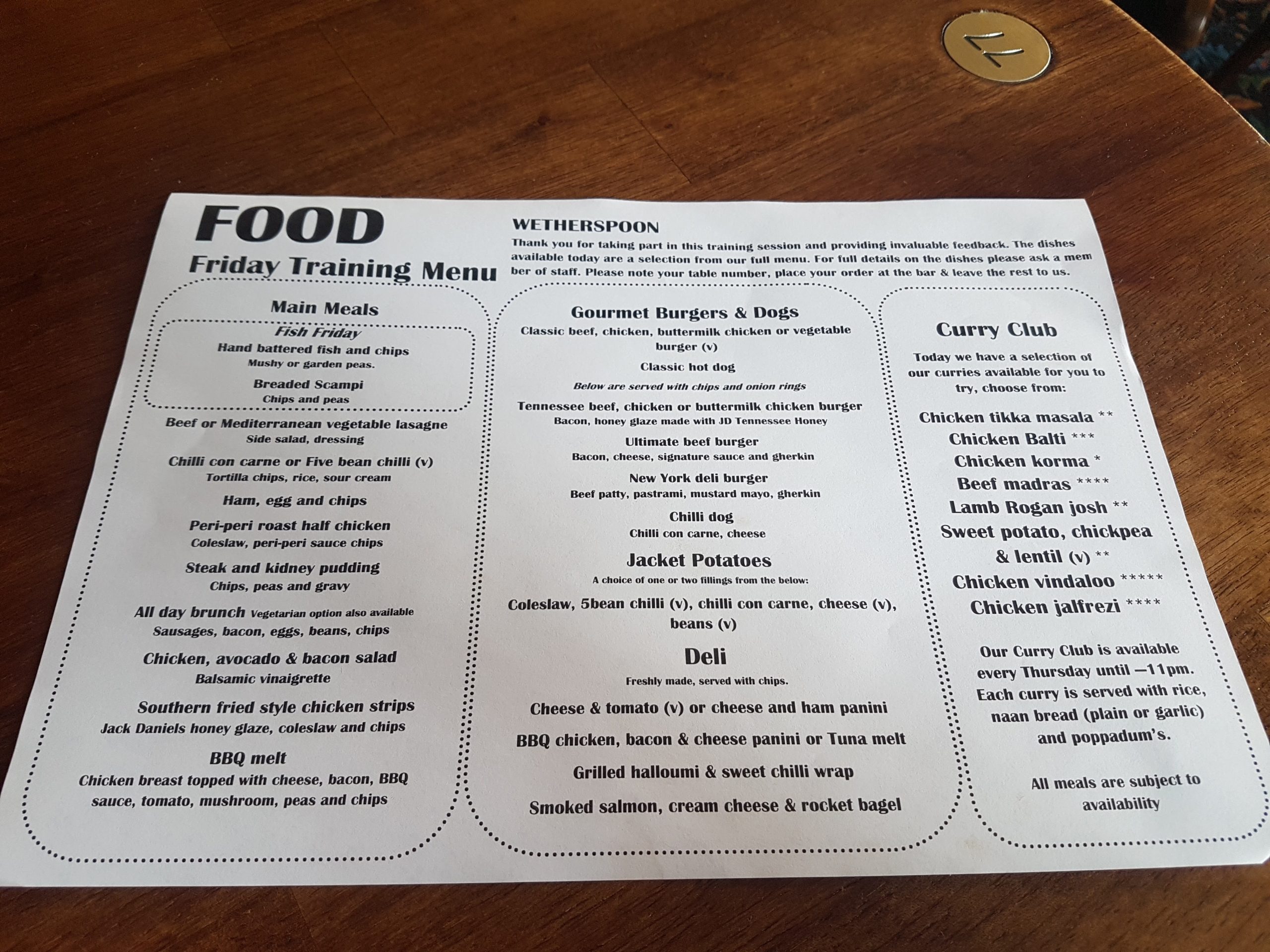 The food I ordered, the half chicken and chips, with coleslaw and peri peri sauce. Unfortunately, Wetherspoons don’t sell this any more. Or indeed the pastrami bagel, but I won’t start about that again.