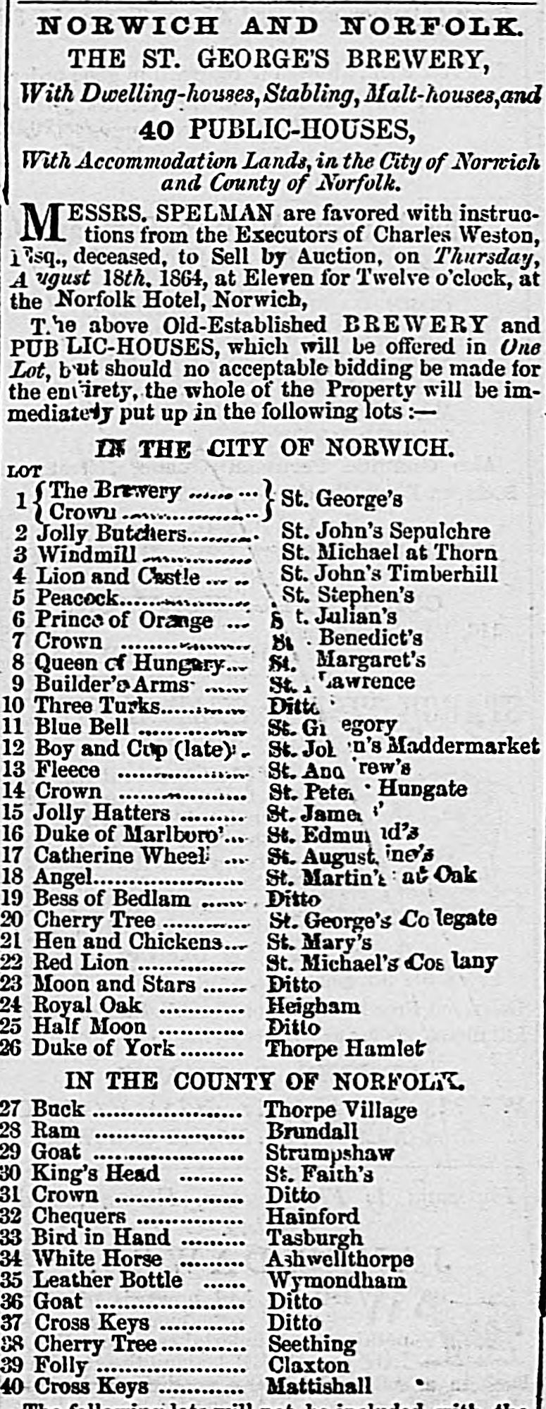MESSRS. Spelman are favored with instructions from the Executors of Charles Weston, Esq., deceased, to Sell by Auction, on Thursday, August 18th, 1864, at Eleven for Twelve o’clock, at the Norfolk Hotel, Norwich.