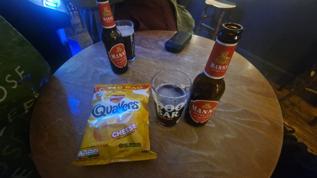 There’s no real ale available and I was struggling to find anything interesting, although Guinness is available as a fall back. I’ve never had it before, but I went for the Mann’s Brown Ale which is brewed by Marston’s. I’ll likely never have it again, it was OK in so much as there was a slight taste of toffee but I’d say that there was more taste of cupboard than anything else. The Quavers were delicious though. Julian liked it more, but I think he likes beers that taste of cupboard. I more look for some sour which tastes of decadent tart fruit or an imperial stout laden with cherries and coconut.