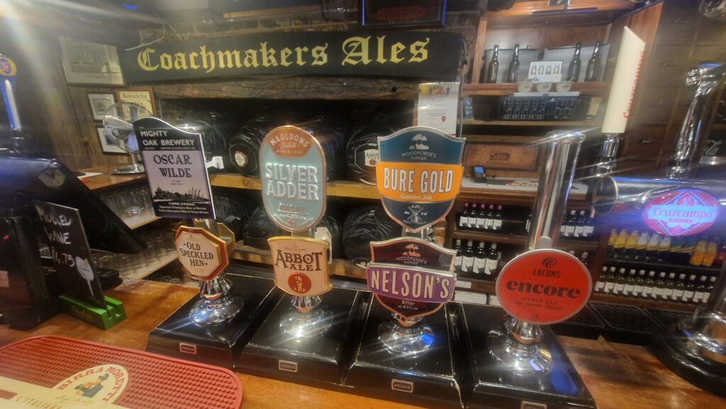 The beer selection, although it wasn’t entirely clear what they did have. I ordered two beers from these pump clips and was told they were unavailable so I thought it best to ask what they did actually have and I wasn’t sure that I was any the wiser, but I think they had the Silver Adder from Mauldons, the Abbot Ale from Greene King and the Old Speckled Hen from Morland (Greene King). I think, but wasn’t told, that customers should ignore the pump clips and just look at the barrels as there’s gravity dispense.