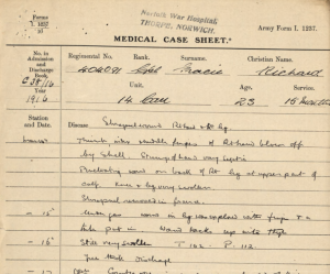 The hospital that Robert was sent to was the Norfolk War Hospital in Thorpe (St. Andrew’s Hospital) and on 15 March he was seen by the doctors there. It was noted that a shell had blown off some of his fingers and the stump of his hand had gone septic. His knee and leg were very swollen and there was a penetrating wound to the upper part of his calf.