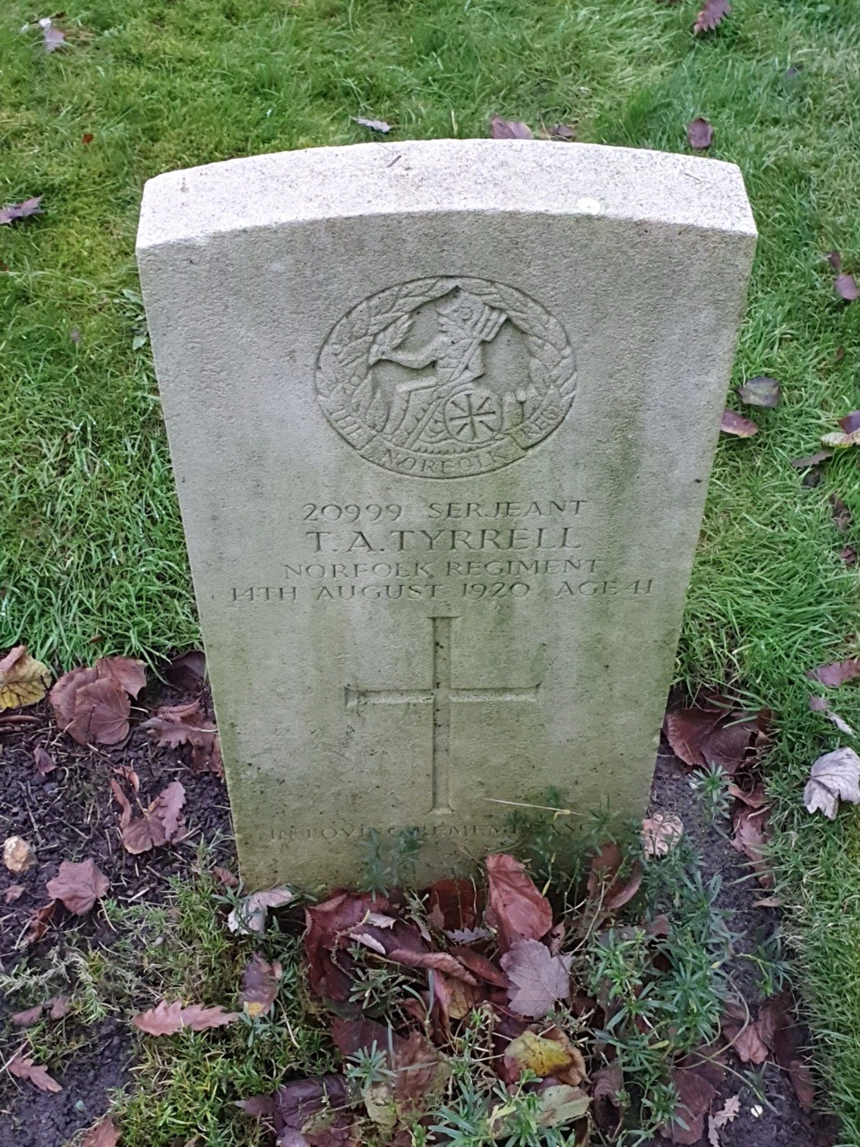 This is the war grave of Thomas Alfred Tyrrell, buried in the older military graves area of Earlham Cemetery. The volume of records that remain about an individual varies so much, there is nearly nothing on some poor souls, whereas for others the documentation is extensive. And this is so for Thomas, whose military records remain intact from his service during and before the First World War.