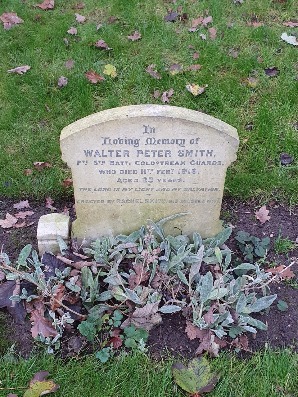 I do know that Walter was born in the third quarter of 1893 and he married Rachel Bailey on 9 May 1915 in St. Augustine’s Church in Norwich. And I know that on 31 March 1915, he joined the 5th battalion of the Coldstream Guards with service number 15935. Walter died on either the 10 February or the 11 February 1916 (different dates for this, but I assume it’s the latter since that’s what is on his grave) at the age of 23.