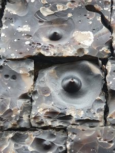 “The Bridewell wall is a classic example of knapped flint, and the picture of the circular feature is just that, flint. Flint is amorphous, i.e. it has no crystal structure to determine the way it breaks, and this block of flint, when broken in half by a hammer has produced this curious bulb…..it is termed conchoidal fracture.