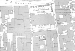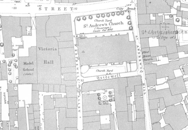 This pathway doesn’t appear to have a name on either old or new maps, but it separates Bridewell Museum from St. Andrew’s Church. And indeed, it appears that if we could go back 500 years to take a photo, this would look nearly exactly the same. Well, other than for the paving, that might not have been as good.