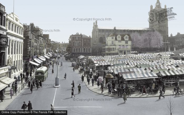 This photo of Gentleman’s Walk is from 1938 and it doesn’t look far different today, just with fewer cars as the area by the market has effectively been pedestrianised. The saddest element of this is that the trams have gone, a decision made in 1933 following the purchase of Norwich Electric Tramways by Eastern Counties Omnibus. All the trams departed from Orford Place and this route would have been Haymarket, Gentleman’s Walk, the Market Place, St. Giles Street and then down Earlham Road. I also wonder how many of those market stalls sold food, I suspect not very many of them. James and I might have found it quicker to do our eating at every market stall thing back then.