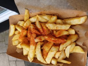 I would normally have something to accompany the chips, but it’s a cold day and I thought that chips would suffice. Medium chips come in at £2 which is towards the higher end of the scale compared to other chip shops in the city, but still seems entirely reasonable to me given the location and quality. I was pleased that the chipotle Tabasco sauce was available, although I didn’t have any today (not least because I tend to use quite a lot of it and that might have been obvious to the staff member, so I’ll wait until Dwayne is there and ask permission first) as I sufficed with that spice stuff (I can’t remember what it’s called, possibly Classic American Chip Spice). The chips were delicious as ever, no complaints there. They are cooked in beef dripping which is a problem for some customers, although if that’s what is required to make the food taste this good, I can see why they do it…..