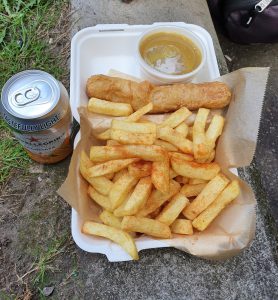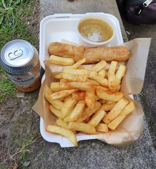 And a photo from September 2020, when it was warmer and we could sit outside. Battered sausage, chips and curry sauce, all equally lovely.