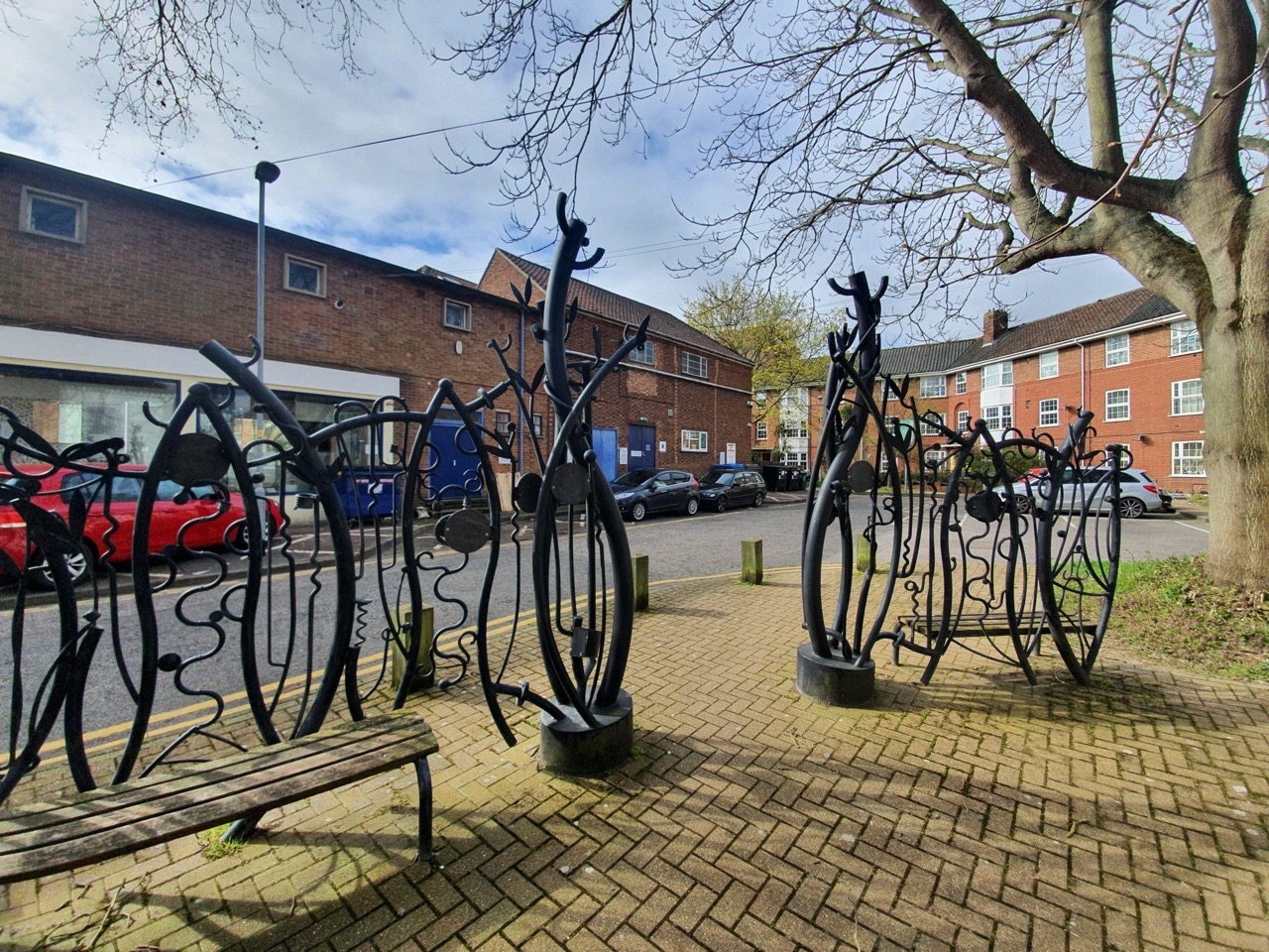 “The railings combine forms which reflect the tree-trunks and leaves with mechanically inspired springs and zigzag forms. They were created both for and with the residents of Brooke Place responsible for modelling the roundels in clay which were then cast in bronze and fixed to the railings.”
