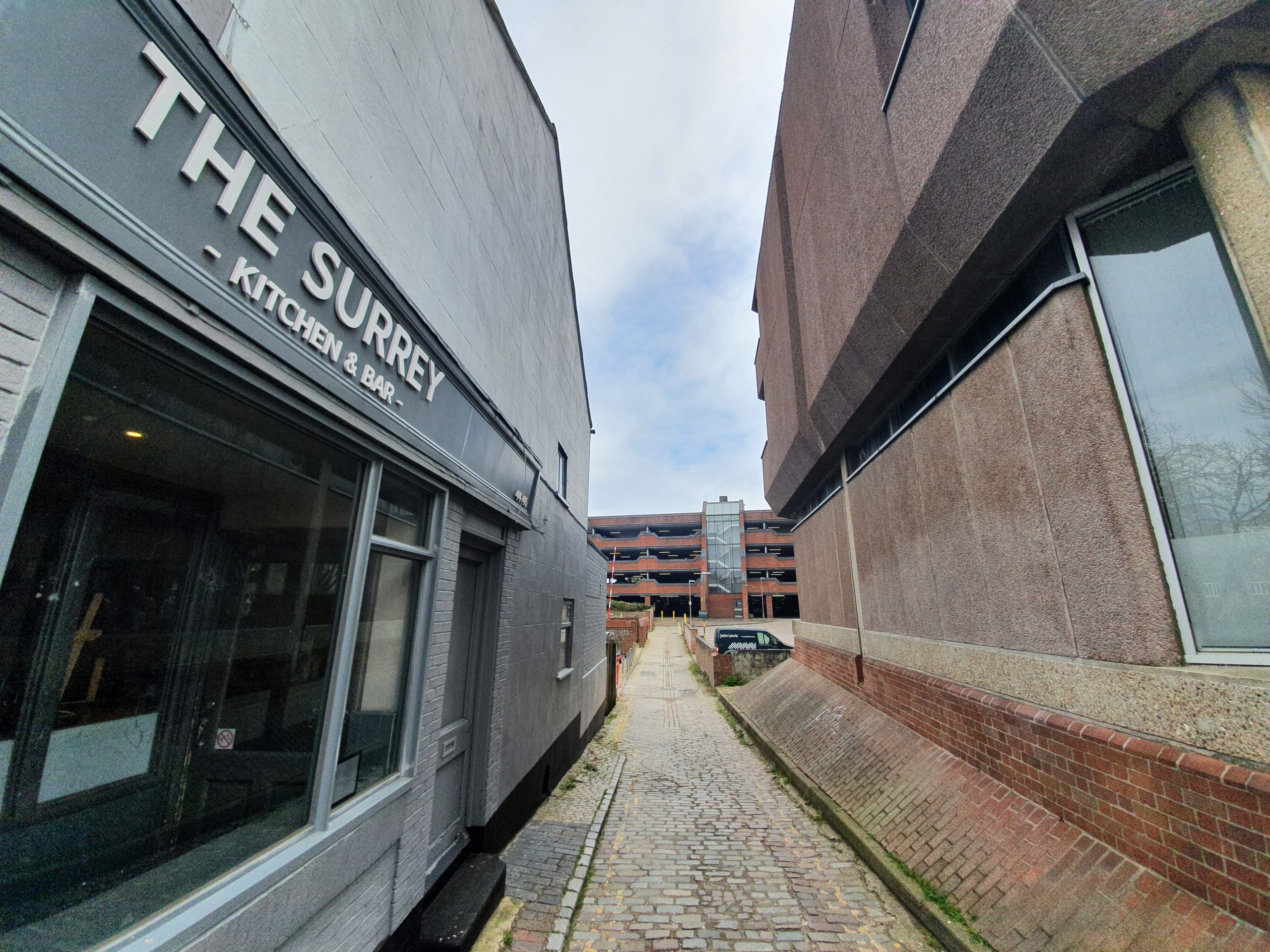 Behind Norfolk Tower is another car park, but this was once where a large baptist church built in 1854 with seats for 1,400 people was located. George Plunkett took a photo of the building in 1979, but it was demolished in 1986. Some of the church might just have projected into the building on the left-hand side, although that’s another car park, this time for John Lewis.