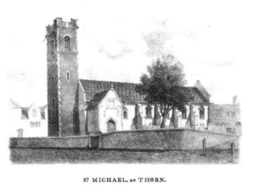 The centre of this parish is (or was) St. Michael at Thorn parish church, located on Thorn Lane. Or, as some local wit has amended it to here, Thorne Lane. The church was originally known as St. Michael on the Hill, but also as St. Michael Spinas, which is the Latin word for thorns. So, they’ve named a church as it had a load of thorn bushes in the churchyard, which were also still there in nineteenth century accounts.