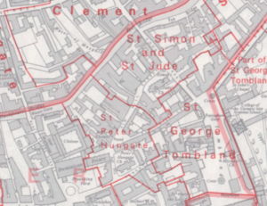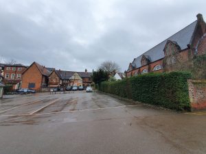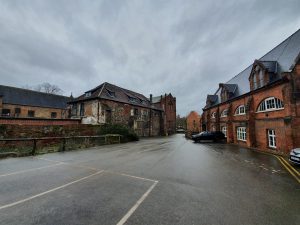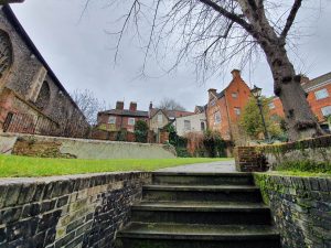 The area next to Blackfriars’ Hall, which isn’t accessible to the public, but the parish boundary runs through the middle of it, along the line of the concrete wall.