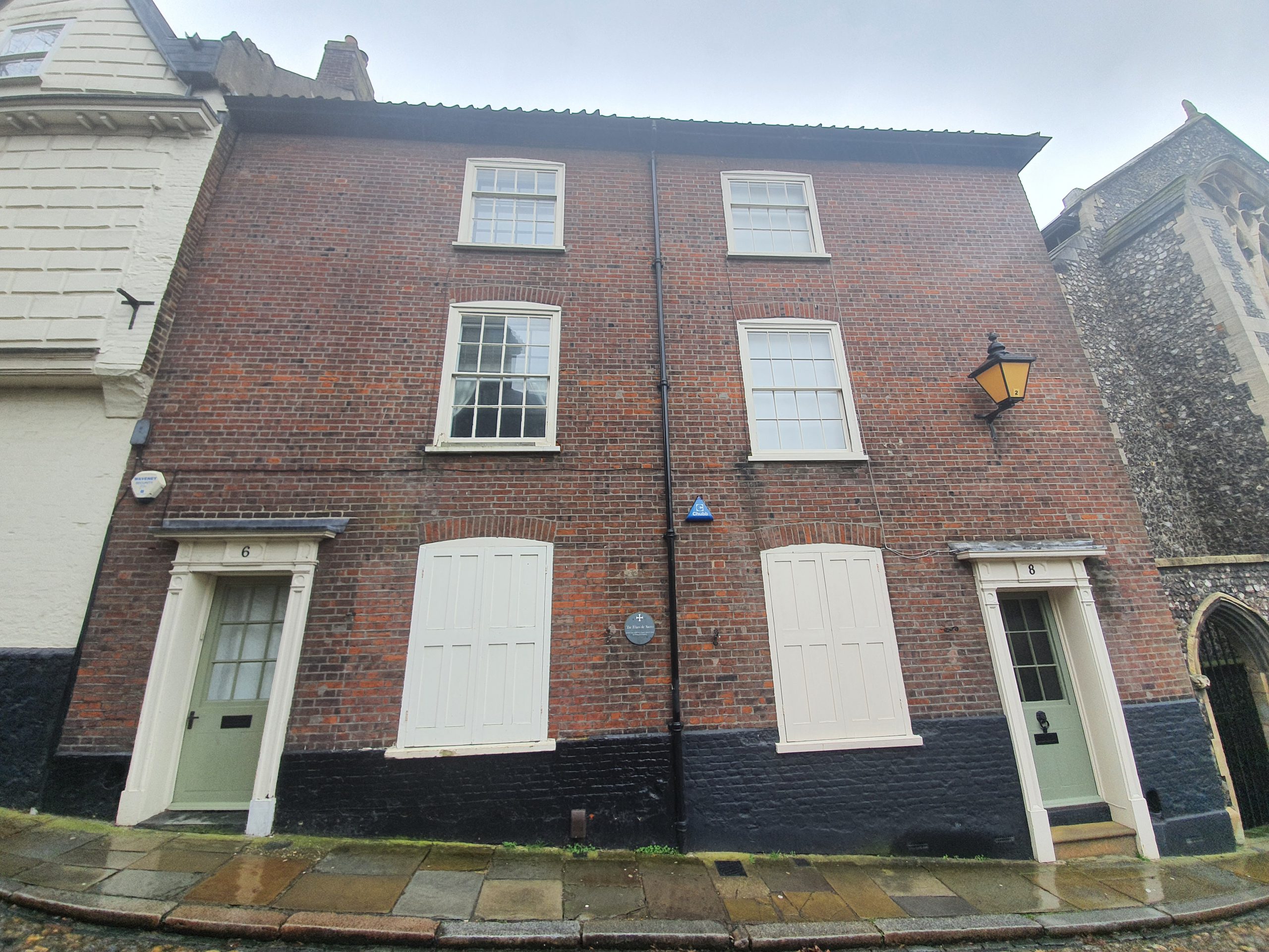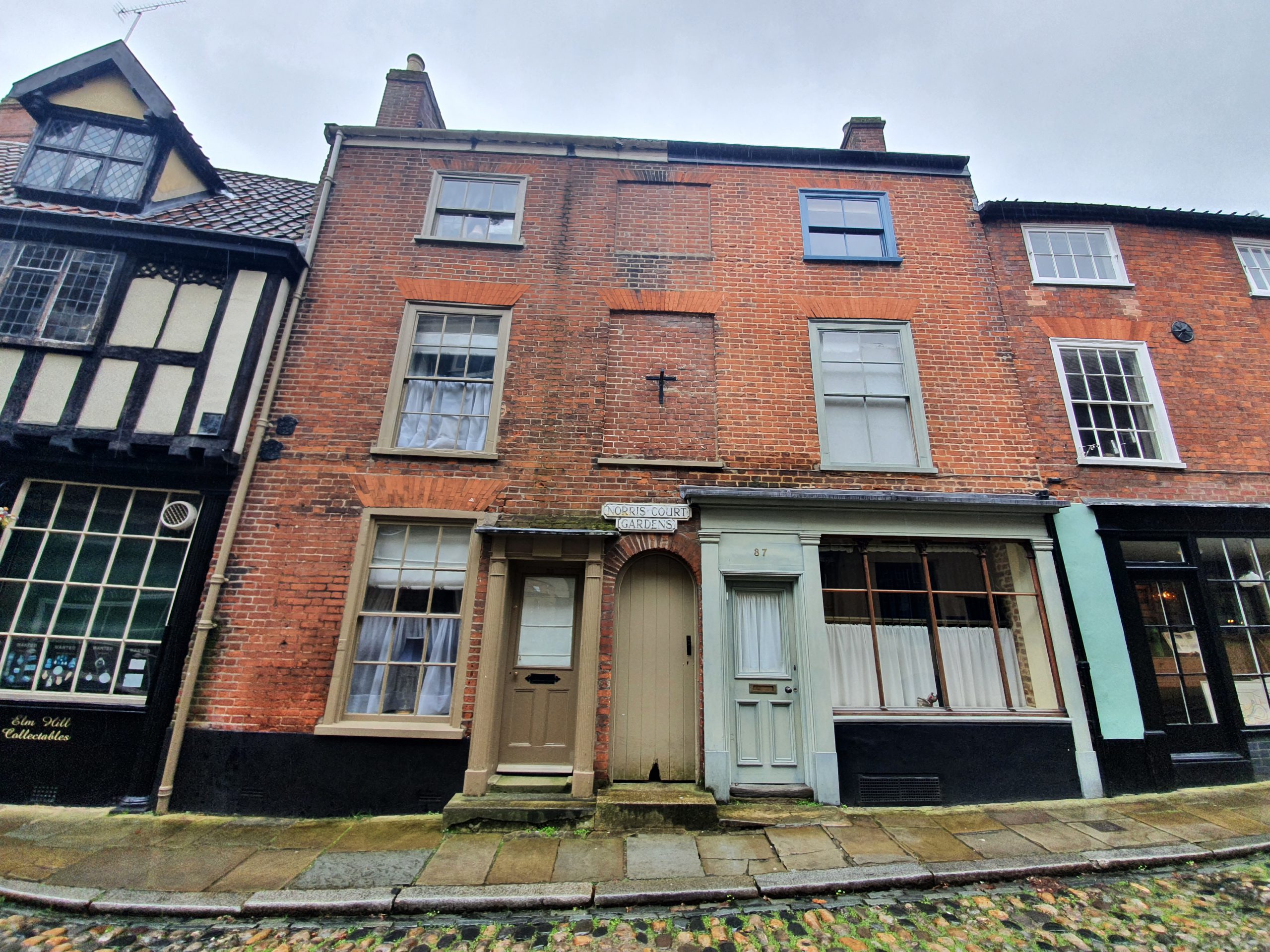At the top of Elm Hill, a pair of eighteenth century residential houses, with a plaque noting that the Friars de Sacco settled in a property on this site which was given to them by William de Gissing in around 1250.