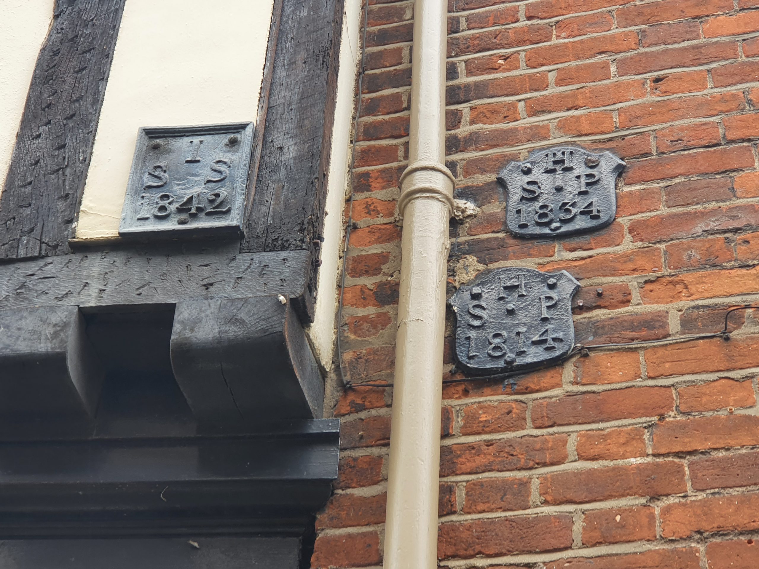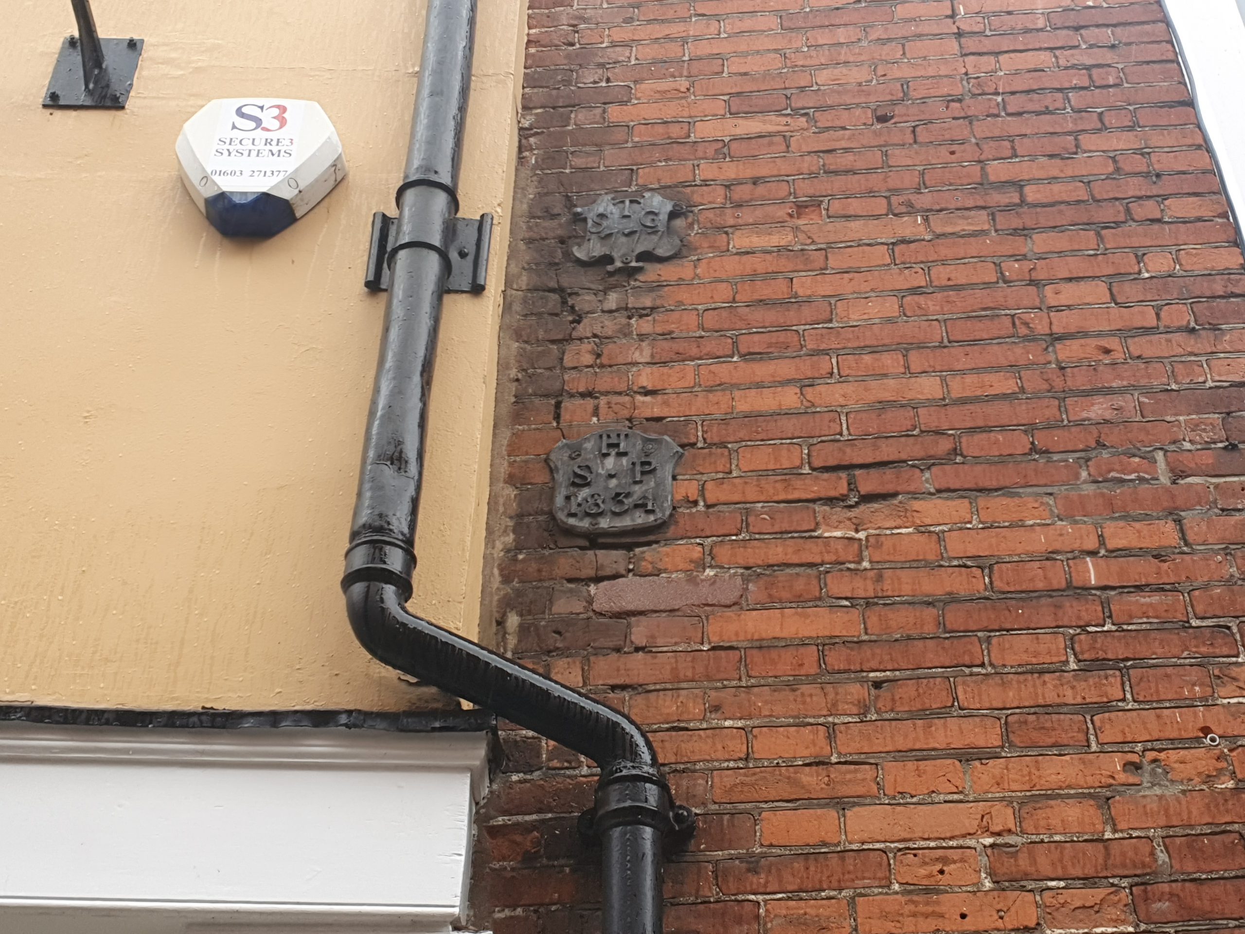 And these are the parish boundary markers on Elm Hill, with the boundary of St. Simon and St. Jude on the left from 1842, and St. Peter Hungate on the right from 1814 and 1834. The parish boundaries are rarely logical, twisting and turning through buildings, so these iron markers really were essential.