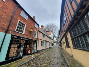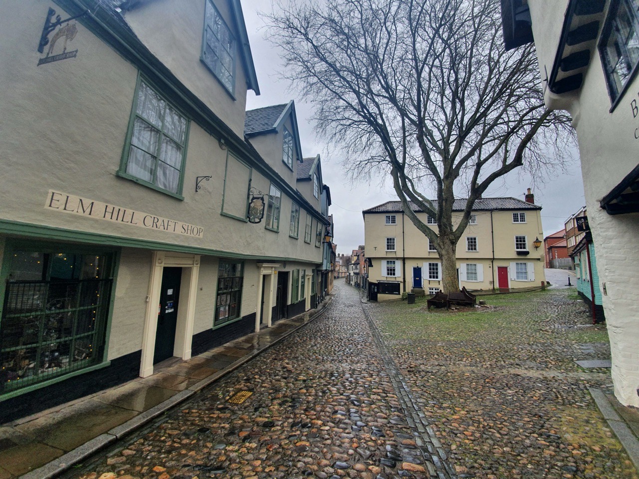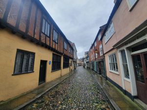 Elm Hill is one of the more historic streets in Norwich and there are numerous Tudor buildings and undercrofts along here. So, what did the city council want to do in the 1920s? They proposed demolishing the properties along here so that they could build a swimming pool. Fortunately, local opposition and the intervention of the Norwich Society saw off these misguided plans and fortunately this marvellous area survived.