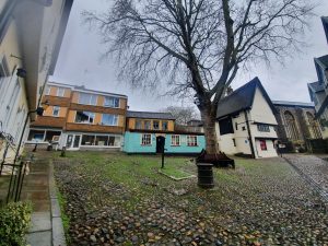 It’s now possible to walk by the River Wensum, but there were once buildings all along here which went down to the riverside. The situation here was that in the medieval period there were some grand properties owned by wealthy merchants on Elm Hill and they would have gone down to the river. Over time, these rear areas were filled with often poor quality residential properties and industrial buildings accessed by courts and yards, most of which were pulled down during slum clearances.