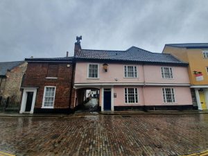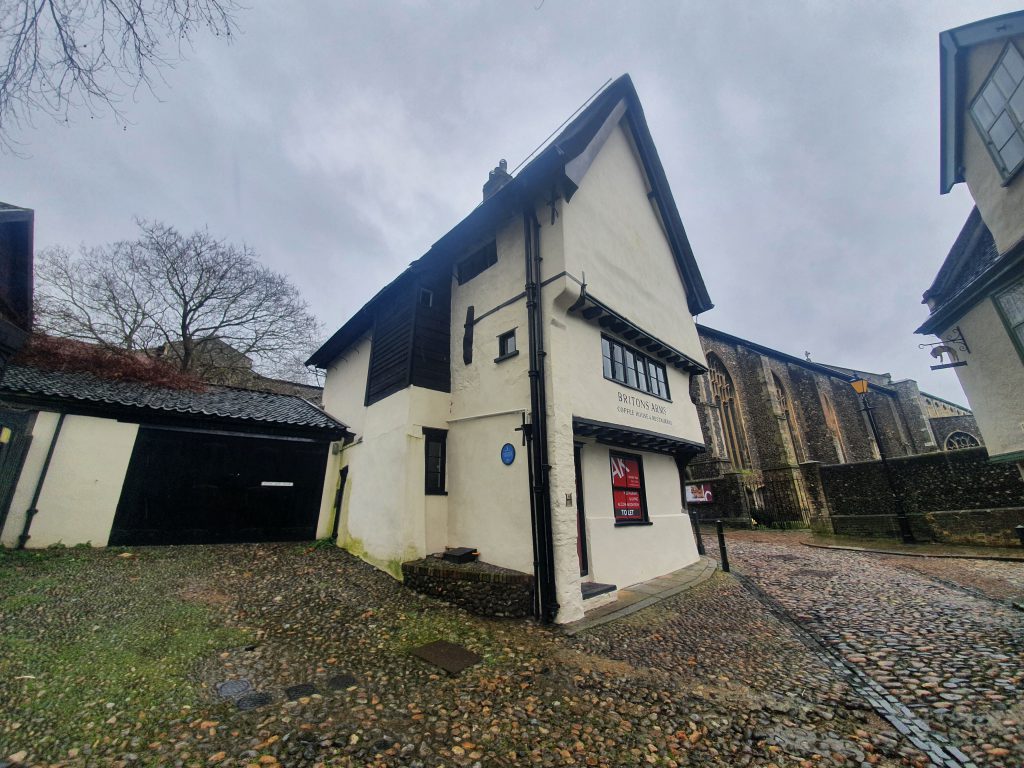 Briton’s Arms is currently closed and is for sale, after being run by sisters Sue Skipper and Gilly Mixer for 45 years. The building likely dates to the middle of the fourteenth century and was a beguinage, or a house for religious women. It was the only house in the street to survive the fire in 1507 and for the next couple of centuries it was used by barbour surgeons and individuals involved in the wool trade. Timothy Gridley, a woolcomber, was perhaps the first landlord here when he was listed as a licensee in 1760. The pub was initially known as the Kings Arms, being changed to the Briton’s Arms in the early part of the nineteenth century. It remained in use as a pub until 1945, when it became a restaurant and cafe.