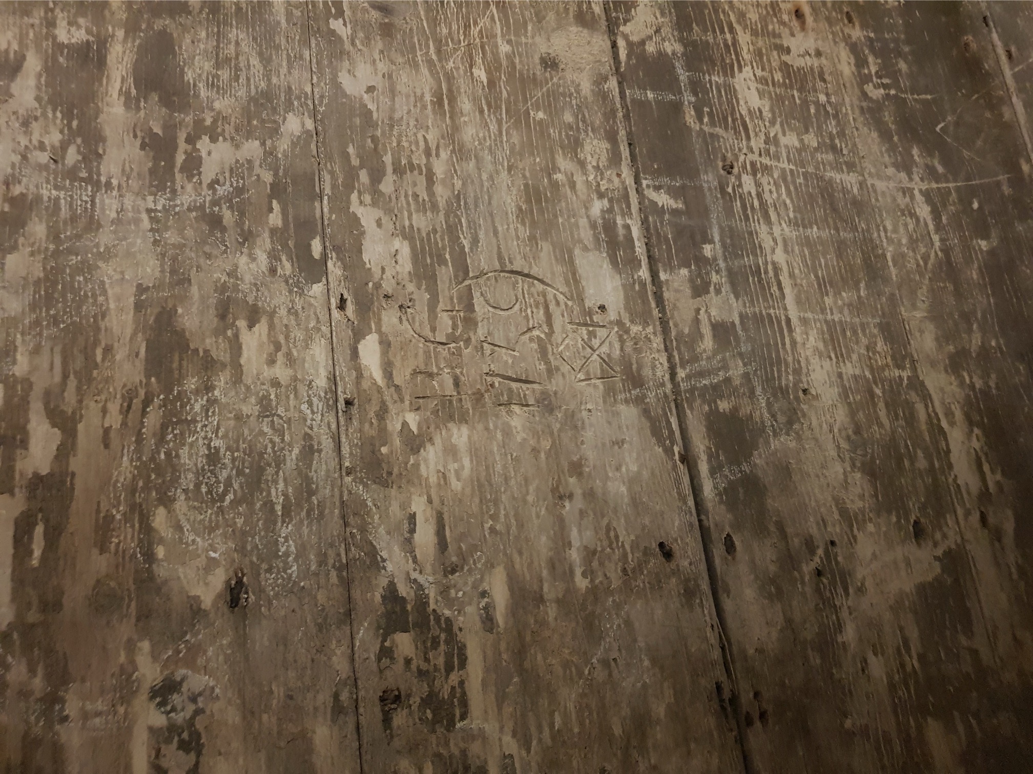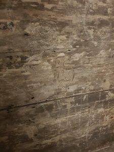 Old graffiti on the wall, seemingly dating to 1739. There’s a similar piece of graffiti in Norwich Cathedral which appears to be representative of a religious building, that’s my best guess for this as well.