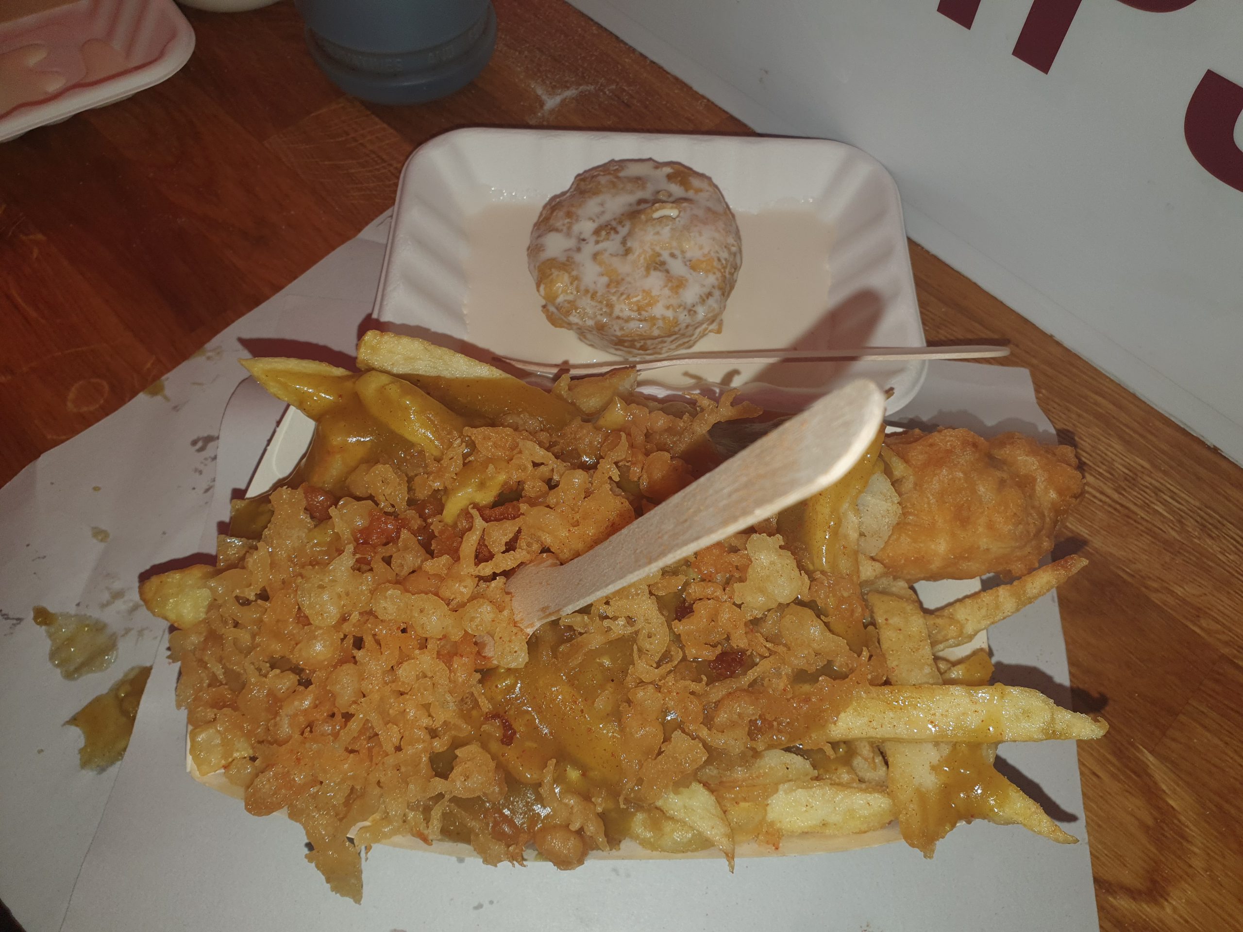 I understand that not everyone has such decadent food orders here, but this is pretty much as good as it gets I think. A main course of chips, battered sausage, curry sauce and scraps, with the sausage being a proper butcher’s sausage. The portion size of chips is generous and they always have scraps available to add texture to the arrangement. And the dessert of battered mince pies in a brandy sauce, this is all clearly Masterchef standard and it’s also evidently very healthy.