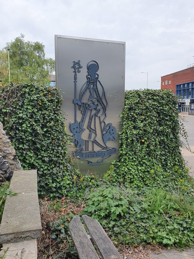 Located at the end of Wellington Lane where it meets St. Benedict’s Street is this metal sculpture of St. Benedict, which I had mistaken for a modern installation. It transpires that the metal relief sculpture itself is from a branch of the National Provincial Bank on St. Benedict’s Street which opened on 27 October 1957. It was installed in this format in 2012 and there’s more information at http://www.racns.co.uk/sculptures.asp?action=getsurvey&id=147.