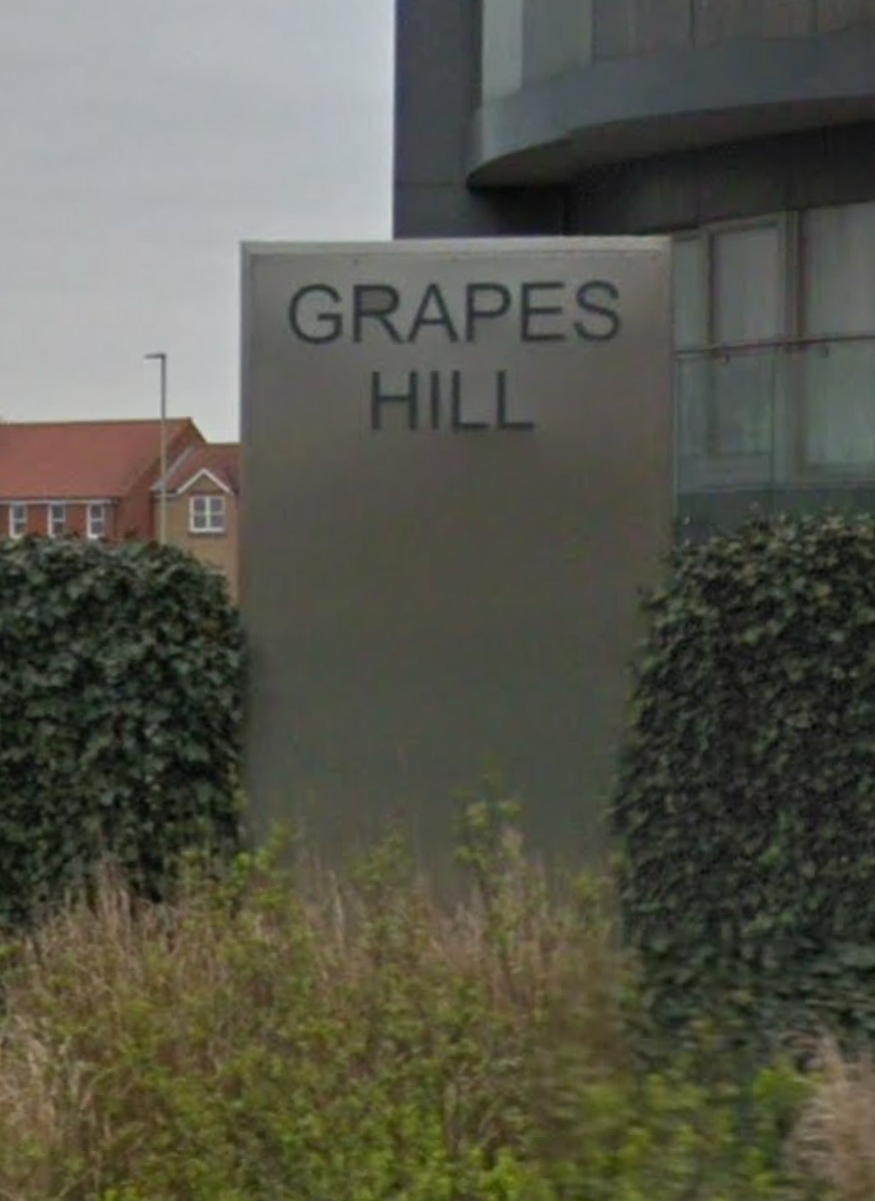 On the reverse is the name of the road that it is next to, Grapes Hill.