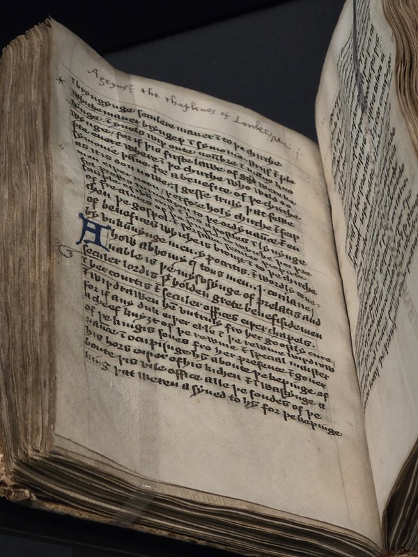 I let ChatGPT have a go at transcribing this and it didn’t cope with it. However, Google Gemini had a lovely time with it, describing it as text by John Wycliffe (c.1328-1384) that was likely published in the fifteenth century. I know this is correct as the museum stated that it is a book of tracts by John Wycliffe and was published between 1400 and 1500.