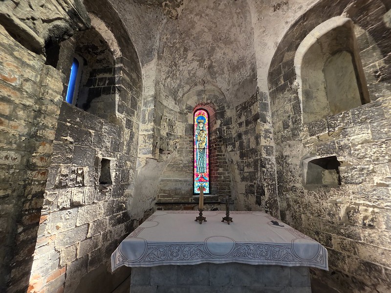 Having noted that, this room seems to me though as something of an incoherent mess in terms of the history, it’s unclear to me what they’re trying to show here. They’ve put a throne into the chapel and the relatively undamaged original sanctuary is in the corner. I’m struggling to believe that the chapel would have once had a large throne looking at the window and no other furniture or religious paraphernalia other than a lectern. I know that we wouldn’t have had rows of pews in here, but the layout seems odd to me.