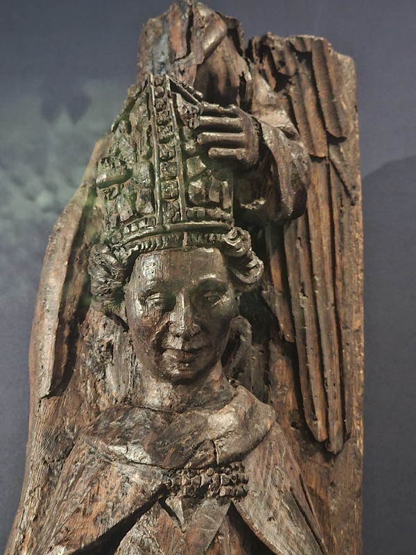 I’m easily intrigued and I really rather liked this wooden statue which is on display at the Gallery of Medieval Life at Norwich Castle Museum. The museum has focused on this as they wanted to show the mitre, the bishop’s headgear as they refer to it, something which had been a thing since around 1000. Interestingly, the mitre went away in the Church of England for several centuries in this country following the Reformation, it has only come back in the last 150 years.