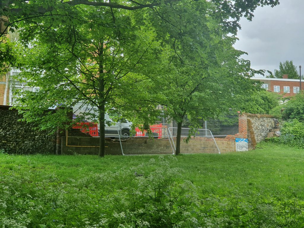 The wall from inside Old Library Wood, a situation I’d suggest isn’t entirely ideal. I hadn’t realised before, but there was a mural at this spot, now nearly entirely demolished. But, no-one was hurt and that’s the main thing.