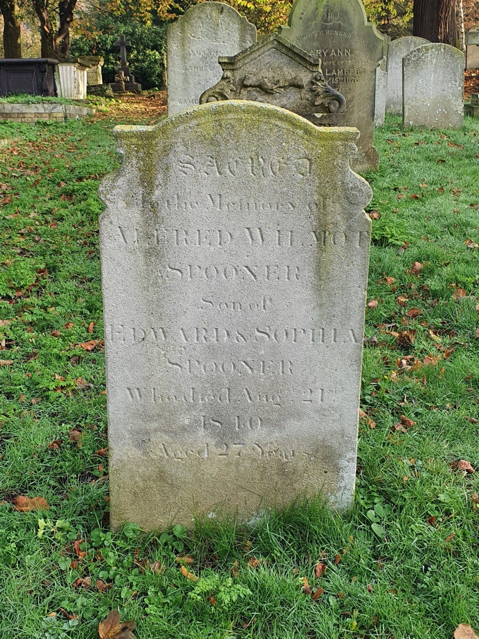 This is the grave of Alfred Wilmot Spooner, located in one of the oldest parts of the cemetery. He was baptised on 6 January 1813 at St. Andrew’s Church in Norwich and was the son of Edward Spooner and Sophia Spooner (nee Gunton) and they had married at St. Peter Mancroft church in April 1807.