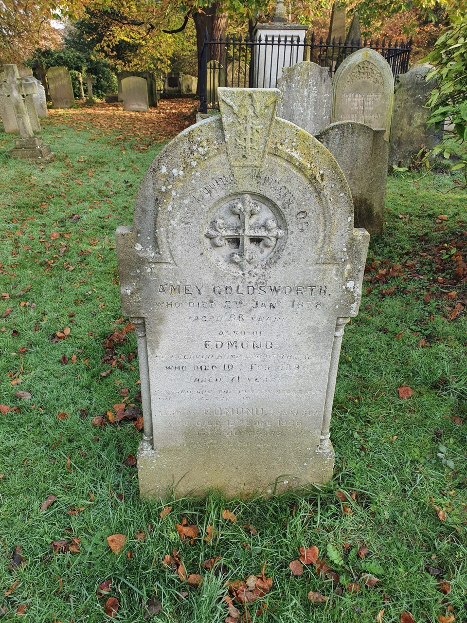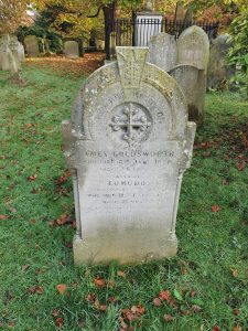 There are three names on this gravestone, that of Amey Goldsworth at the top (c.1822-1878), her husband Edmund (1819-1890) and their son Edmund (1846-1926). Edmund, son of Edmund and Susan, was baptised on 18 May 1819 in St. Mary in the Marsh church in Norwich, which is interesting as this parish church was pulled down some centuries ago. Instead, baptisms and the like took place in St. Luke’s Chapel within Norwich Cathedral (this is the chapel next to Edith Cavell’s grave site).