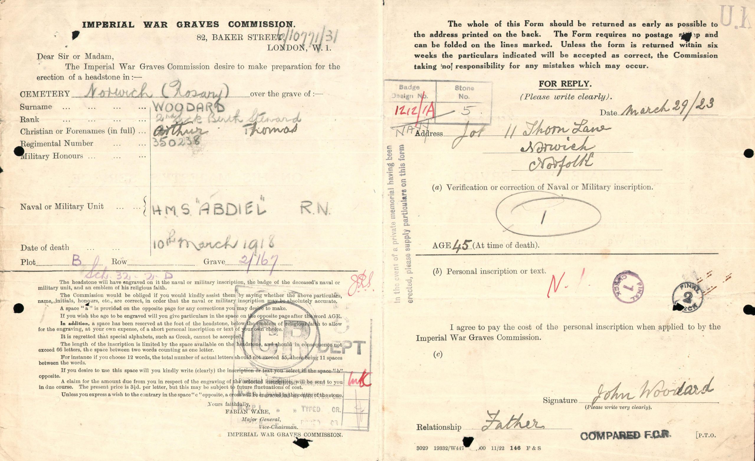 At the time of his death, Arthur’s parents were living at 11 Thorn Lane in the city and his father had to sign this letter to confirm the details of what they wanted on their son’s grave. I can’t quite imagine the emotions that parents and loved ones went through when sending these forms back to the Imperial War Graves Commission. It’s nice though to see that someone is still tending his grave, with Arthur being one of 31 Commonwealth War Graves at the cemetery.