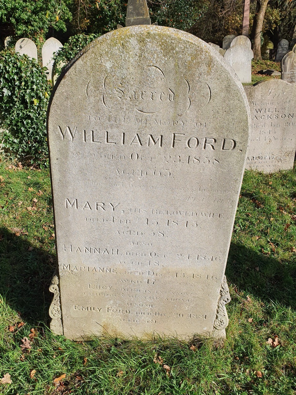I nearly gave up with my researches into this family, as I was struggling to find anything of much interest relating to William Ford and his wife Mary Ford. That is, except from the very sad nature of the lives mentioned on the gravestone. Mary Ford, William’s wife, died in 1845 at the age of 58, having already lost their daughter Lucy in infancy, but then their children Hannah and Marianne both died in 1846, at the ages of 18 and 17 respectively.