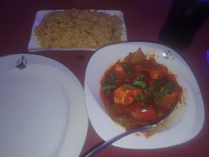 The poppadoms and dips. These were inadequate and generic, with one of them having so much garlic taste as to be inedible. As Will said in the Inbetweeners, “I’m not expecting sparkling”, but I want something slightly interesting…..
