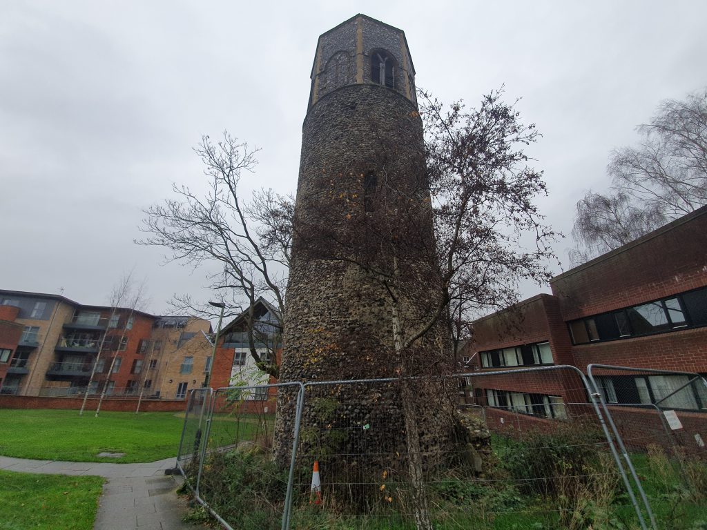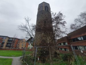 This is a sad end to the church, although a designer at one point tried to make it the centrepiece of a new housing development. Personally, I’m unsure why a decision wasn’t made to secure and retain the walls that were left, making the area into a peaceful park and then putting the housing around that. Instead, this is probably the inevitable outcome, but at least the tower is still here.