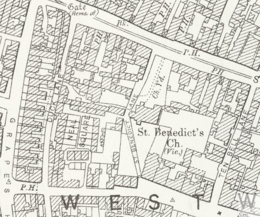 This is the rather urban environment from 100 years ago, with the landscape now entirely changed. Grapes Hill has been mostly destroyed by road construction, whilst the Second World War saw the end to this area of housing. And, indeed, also to St. Benedict’s Church, destroyed by German bombers in 1942.