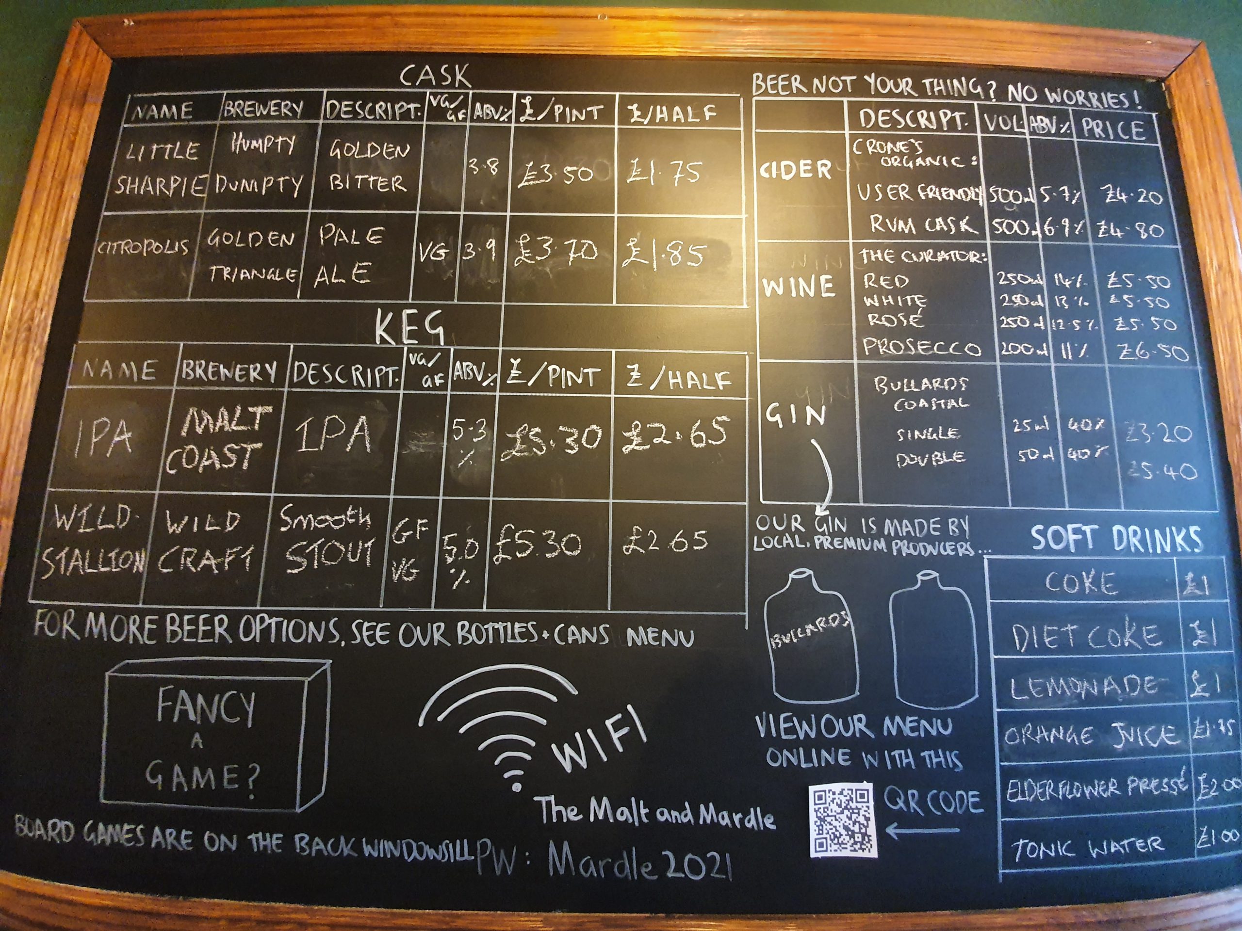 This is a nicely done board, clear and informative. There’s a nod towards local breweries with the cask and keg options, but there’s a more national approach with the bottles menu, including some from the rather excellent Brew By Numbers brewery. I note, with great approval, that the half pint options cost exactly half of what a pint costs.