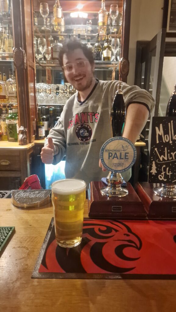 The York does an evening meal deal thing for £12 which includes a pint of real ale, a rather agreeable deal. The deal, of which I got the last one, was the venison sausages with braised cabbage, mash potatoes and a red onion gravy. Julian had some decadent steak option, but he’s getting quite middle class if I’m being honest ever since he’s become a senior pub executive. Anyway, the sausages were meaty and delicious, the mash was smooth and the gravy was plentiful. My crisis at the time was my phone kept losing charge, but Tom resolved that problem (just as Charlie had to resolve that problem in North Walsham – there’s a theme here that won’t continue now I have my new phone) so all was well. My second beer was the All Day Long which was malty, bitter and went well with those sausages. I must admit I thought that I had ordering halves, but Julian expressed concerned that this wasn’t sufficient to go with a meal. He’s very good at that sort of logical thinking.
