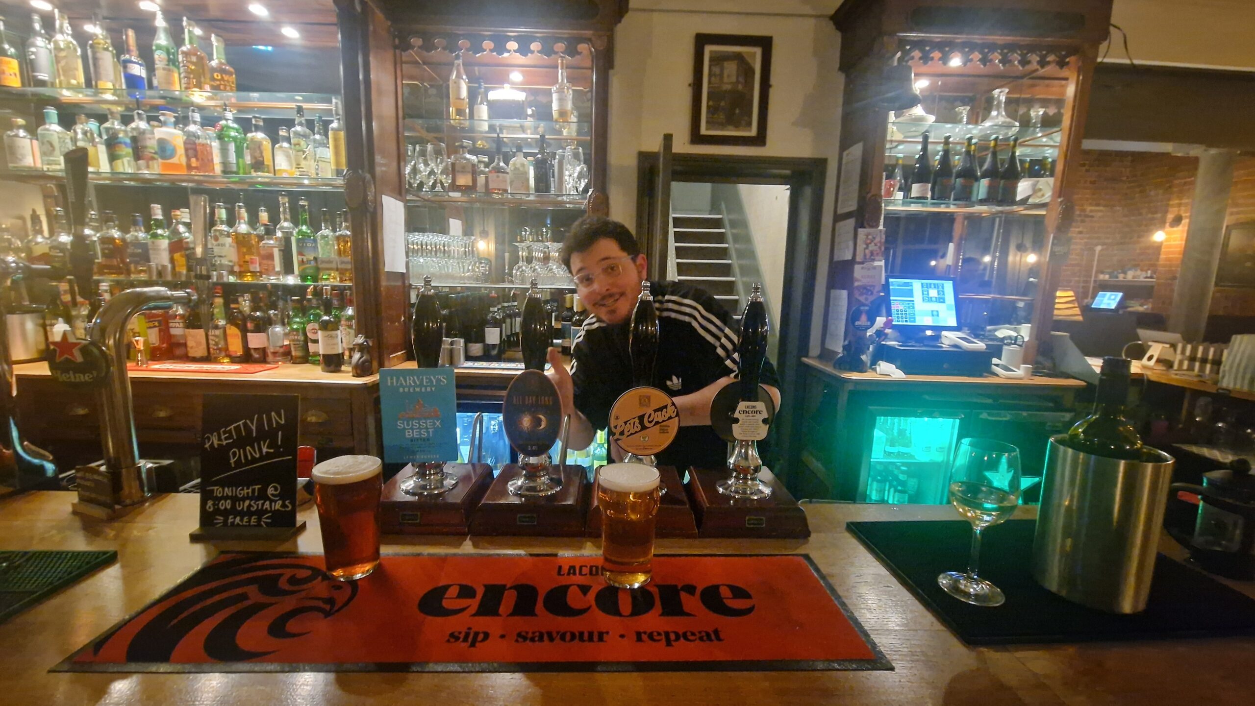 Back to modern times and the official visit from the Two Julians (we never announce in advance that we’re coming, we don’t want any red carpet quickly thrown outside for us). There were three real ales on, the Sussex Best from Harvey’s, the All Day Long from All Day Brewing Company and the Let’s Cask from All Day Brewing Company. I went for the latter option first, which was smooth with slight Twix flavours and was well kept. As can be seen, there’s often usually a fourth ale as well, but the Encore from Lacons had just run out.