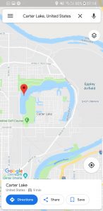 I’m going to the airport soon, the one on the right hand side of the above map. But I thought that Carter Lake, in the centre of the map, was intriguing because of the state boundaries. The lines through the middle show that Carter Lake is part of Iowa, even though it’s clearly in what is otherwise Nebraska territory. The ox-bow lake is the clue, the area flooded in 1877 and the river line drawn up dividing the states changed.