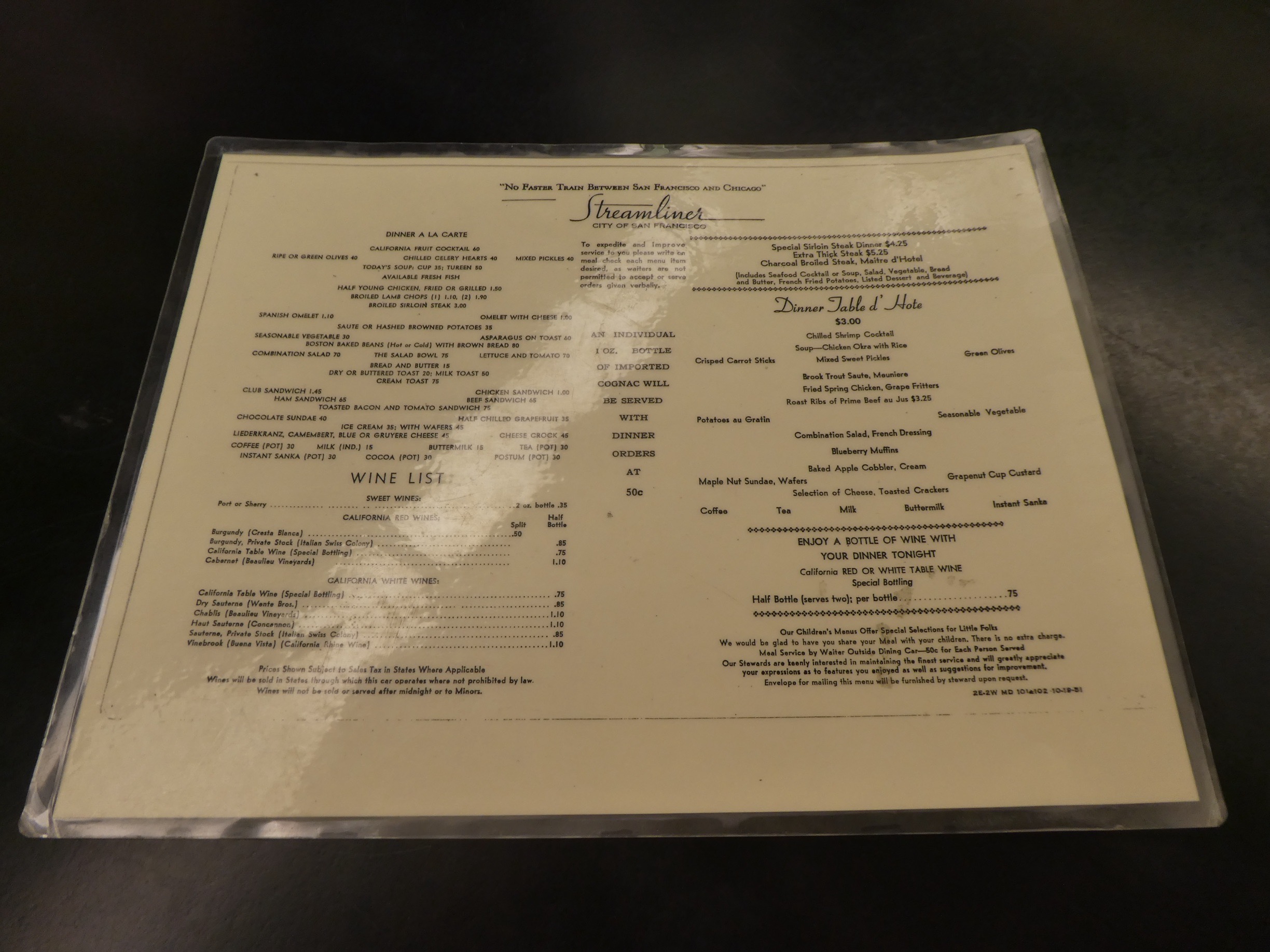 Copies of menus from the period, dating from 1950. There was an interesting policy that “to expedite and improve service to you please write on meal check each menu item desired, as waiters are not permitted to accept or serve orders given verbally”.