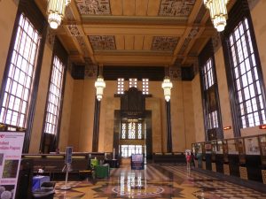 Anyway, the floor dates to 1931 and is a terrazzo floor which is hard wearing and also decorative. At this railway station the floor was designed to complement the art deco elements of the rest of the Grand Hall. Terrazzo is made of chips of marble which are then poured into a polymeric material, all very much of an art form.